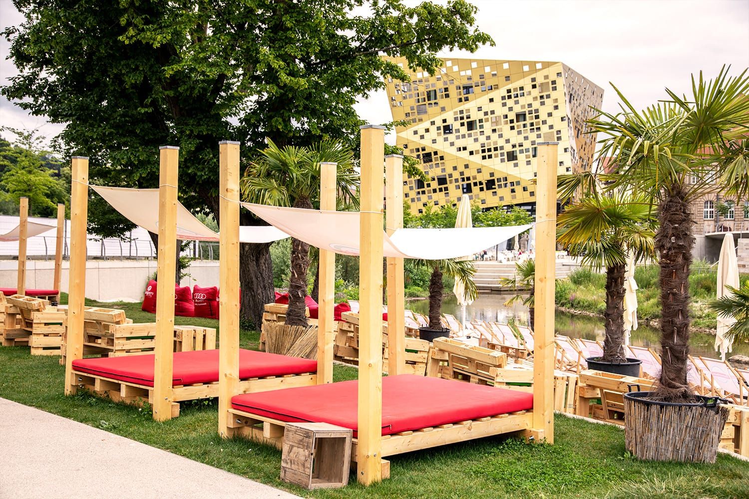 Unsere von Palmen geschmückte Strandbar direkt an der Rems fühlt sich an wie ein entspannter Urlaubstag. Jedes Jahr, bei herrlichem Wetter, erwarten die Gäste kühle Getränke und fruchtige Shishas in einem relaxten Ambiente. Hier werden ausreichend Sitzmöglichkeiten, sowie Liegestühle und gemütliche Himmelbetten angeboten, wo jeder den Urlaubsflair mit Drinks und einem tollen Ausblick direkt auf die Rems genießen kann.